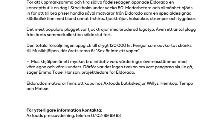 I år fyller Axfoods eget varumärke Eldorado 50 år. Födelsedagen firades bland annat med en tillfällig konceptbutik i Stockholm där allmänheten kunde köpa Eldorado-kläder och produkter. Nu skänker Eldorado intäkterna på över 120 000 kronor till Musikhjälpen.