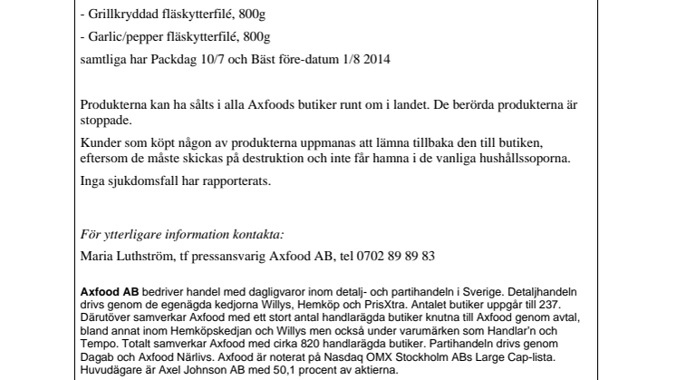 Produkterna kan ha sålts i alla Axfoods butiker runt om i landet. De berörda produkterna är stoppade.
