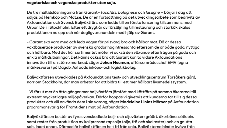 - Garant ska vara med och leda vägen för prisvärd, bra och hållbar mat. Då är dessa växtbaserade produkter av svenska grödor högintressanta eftersom de är både goda, nyttiga och hållbara. Med det här sortimentet möter vi också den växande efterfrågan på goda och enkla måltidslösningar. Det känns också bra att Garant kan ta vidare Axfoundations innovation till en större marknad, säger Johan Neuman, affärsområdeschef EMV (egna märkesvaror) på Dagab, Axfoods inköps- och logistikbolag.