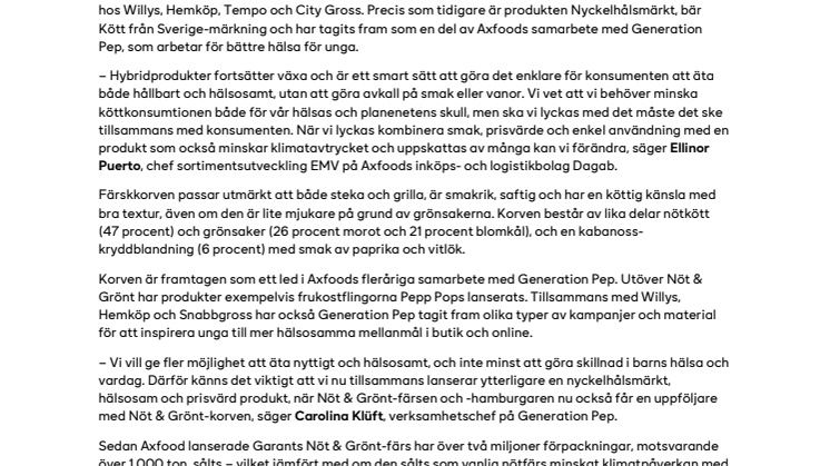Nu kommer nästa produkt, när Garants nya Nöt & Grönt Färskkorv Kabanoss landar i butikshyllorna hos Willys, Hemköp, Tempo och City Gross. Precis som tidigare är produkten Nyckelhålsmärkt, bär Kött från Sverige-märkning och har tagits fram som en del av Axfoods samarbete med Generation Pep, som arbetar för bättre hälsa för unga.