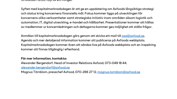 Anmälan till kapitalmarknadsdagen görs genom att skicka ett mail till osa@axfood.se. Agenda och mer detaljerad information kommer att publiceras på Axfoods webbplats. Kapitalmarknadsdagen kommer även att sändas live på Axfoods webbplats och en inspelning kommer att finnas tillgänglig i efterhand.