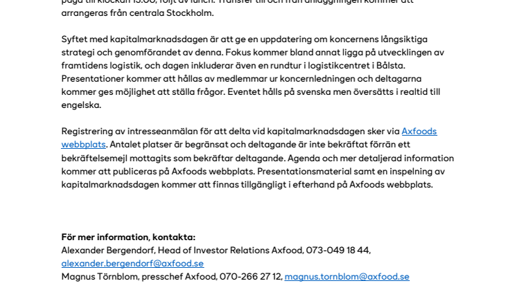 Kapitalmarknadsdagen kommer att hållas på Axfoods nya högautomatiserade logistikcenter, Björnängsvägen 16 i Bålsta utanför Stockholm. Eventet inleds klockan 9.00 och beräknas pågå till klockan 13.00, följt av lunch. Transfer till och från anläggningen kommer att arrangeras från centrala Stockholm.