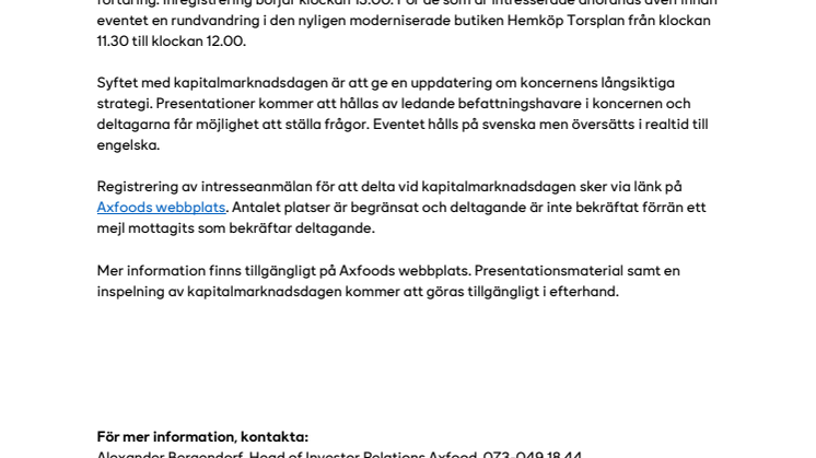 Mer information finns tillgängligt på Axfoods webbplats. Presentationsmaterial samt en inspelning av kapitalmarknadsdagen kommer att göras tillgängligt i efterhand.