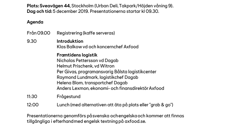 Presentationerna genomförs på svenska och engelska och kommer att finnas tillgängliga i efterhand med engelsk textning på axfood.se.