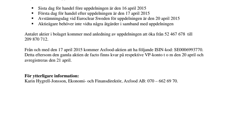 Som tidigare kommunicerats har årsstämman i Axfood Aktiebolag (publ) den 18 mars 2015 beslutat om en uppdelning av aktier i bolaget (s k split) så att varje nu befintlig aktie delas upp i fyra aktier (4:1).