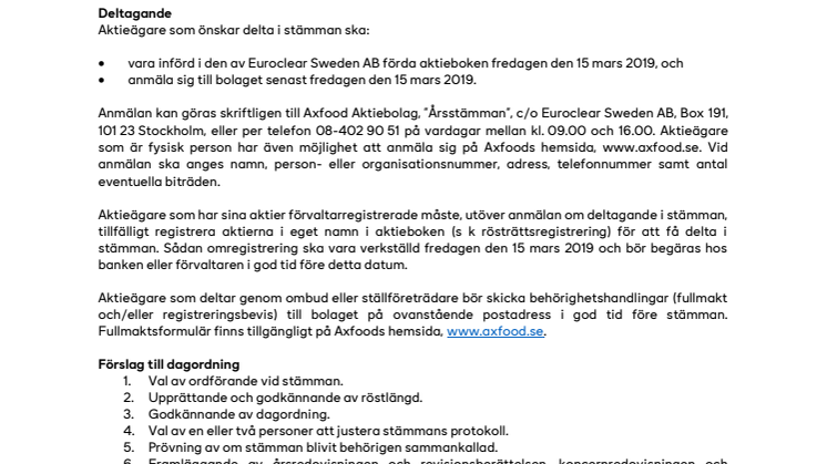 Välkommen till årsstämma i Axfood Aktiebolag (publ), org. nr 556542-0824, torsdagen den 21mars 2019 kl. 17.00 i Konserthuset (Stora Salen), Hötorget (huvudentré), i Stockholm. Inregistrering till stämman börjar kl.16.00.