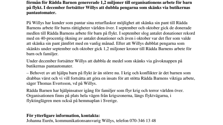 Engagemanget och viljan att hjälpa i flyktingkrisen är fortsatt stort. Willys kampanj till förmån för Rädda Barnen genererade 1,2 miljoner till organisationens arbete för barn på flykt. I december fortsätter Willys att dubbla pengarna som skänks via butikernas pantautomater.