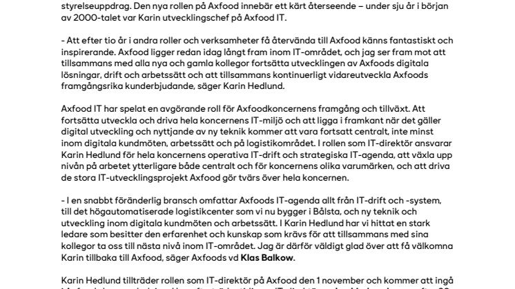 - I en snabbt föränderlig bransch omfattar Axfoods IT-agenda allt från IT-drift och -system, till det högautomatiserade logistikcenter som vi nu bygger i Bålsta, och ny teknik och utveckling inom digitala kundmöten och arbetssätt. I Karin Hedlund har vi hittat en stark ledare som besitter den erfarenhet och kunskap som krävs för att tillsammans med sina kollegor ta oss till nästa nivå inom IT-området. Jag är därför väldigt glad över att få välkomna Karin tillbaka till Axfood, säger Axfoods vd Klas Balkow.