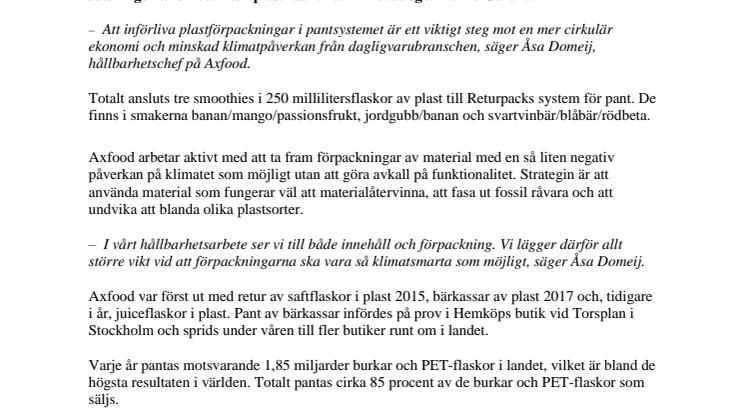 Axfood var först ut med retur av saftflaskor i plast 2015, bärkassar av plast 2017 och, tidigare i år, juiceflaskor i plast. Pant av bärkassar infördes på prov i Hemköps butik vid Torsplan i Stockholm och sprids under våren till fler butiker runt om i landet.