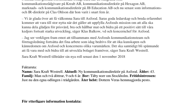 –Jag ser verkligen fram emot att tillsammans med Axfoods kommunikationsteam och företagsledning fortsätta det fina arbete som idag bedrivs för att öka kunskapen och kännedomen om Axfood och koncernens olika varumärken. Det ska samtidigt bli spännande att få vara med och bidra till att utveckla bolaget framöver, säger Sara Kraft Westrell.