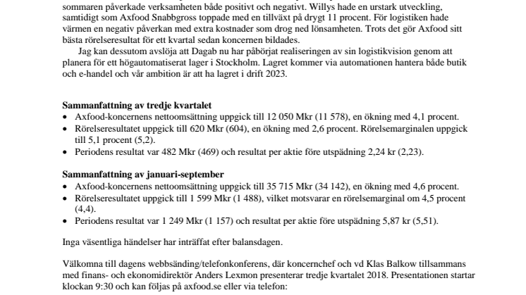 Välkomna till dagens webbsänding/telefonkonferens, där koncernchef och vd Klas Balkow tillsammans med finans- och ekonomidirektör Anders Lexmon presenterar tredje kvartalet 2018. Presentationen startar klockan 9:30 och kan följas på axfood.se eller via telefon:
