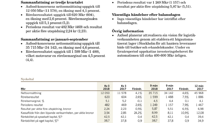 Denna information är sådan information som Axfood Aktiebolag (publ) är skyldigt att offentliggöra enligt EU:s marknadsmissbruksförordning och lagen om värdepappersmarknaden. Informationen lämnades, genom ovanstående kontaktpersons försorg, för offentliggörande den 24 oktober 2018 klockan 7:00 CET.