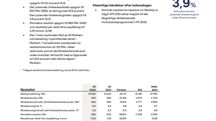 - Den 1 mars avyttrades Mat.se till Mathem mot betalning i nyemitterade aktier i Mathem. Transaktionen resulterade i en realisationsvinst om 221 Mkr, vilken redovisats som en jämförelsestörande post under kvartalet. Axfood är med en ägarandel om 16,5 procent näst största ägare i Mathem.