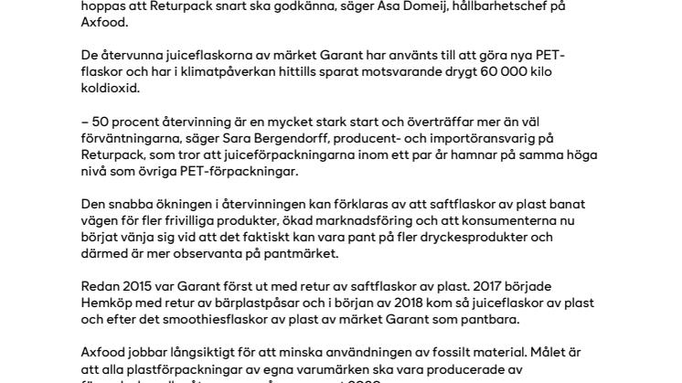 Garant, Axfoods eget varumärke, var en av de första att med hjälp av pant materialåtervinna juiceflaskor av plast. Efter ett år är resultatet långt över förväntan: Varannan flaska går i retur.