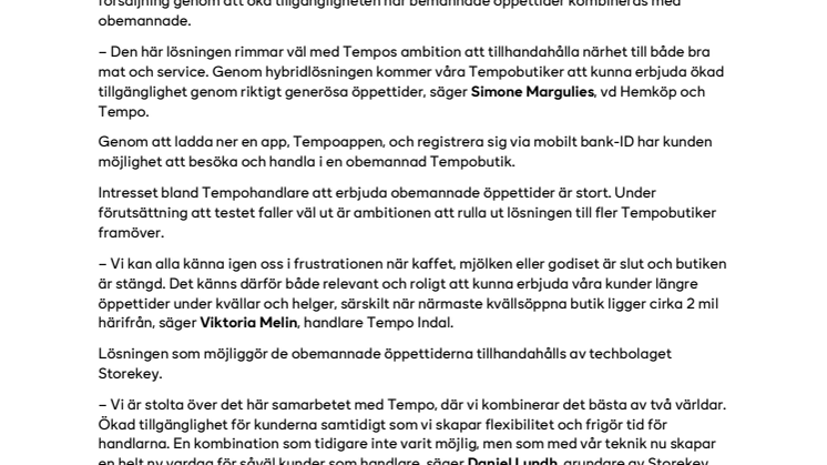 – Vi är stolta över det här samarbetet med Tempo, där vi kombinerar det bästa av två världar. Ökad tillgänglighet för kunderna samtidigt som vi skapar flexibilitet och frigör tid för handlarna. En kombination som tidigare inte varit möjlig, men som med vår teknik nu skapar en helt ny vardag för såväl kunder som handlare, säger Daniel Lundh, grundare av Storekey.