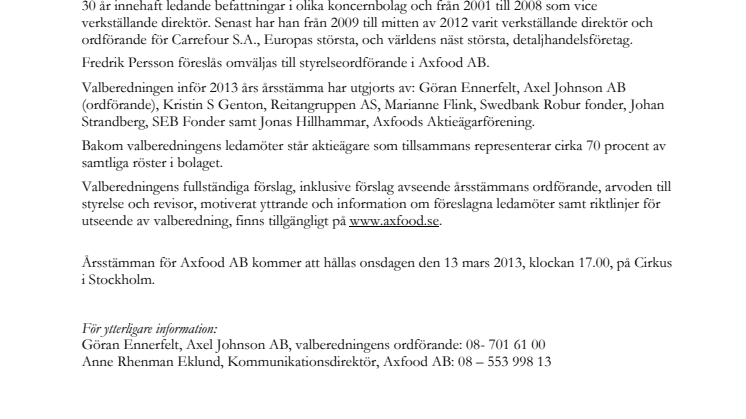 Inför årsstämman den 13 mars 2013 föreslår valberedningen i Axfood AB omval av styrelseledamöterna Antonia Ax:son Johnson, Peggy Bruzelius, Fredrik Persson, Odd Reitan, Marcus Storch och Annika Åhnberg samt nyval av Lars Olofsson.