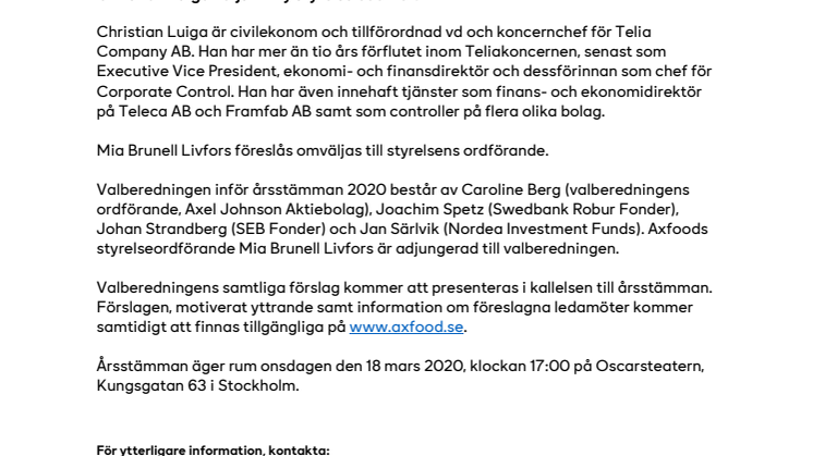 Inför årsstämman den 18 mars 2020 föreslår valberedningen för Axfood Aktiebolag omval av styrelseledamöterna Mia Brunell Livfors, Stina Andersson, Fabian Bengtsson, Caroline Berg, Jesper Lien, Lars Olofsson och Christer Åberg samt att Christian Luiga väljs till ny styrelseledamot.