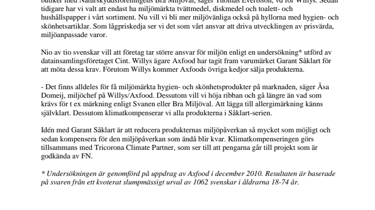 Nio av tio svenskar vill att företag tar större ansvar för miljön enligt en undersökning* utförd av datainsamlingsföretaget Cint. Willys ägare Axfood har tagit fram varumärket Garant Såklart för att möta dessa krav. Förutom Willys kommer Axfoods övriga kedjor sälja produkterna.