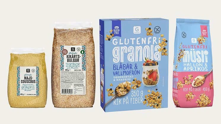 Nu utökar Garant sitt sortiment med fyra glutenfria produkter. Nyheterna omfattar matgrynerna Majscouscous och Kikärtsbulgur och frukostflingor i smakerna Granola blåbär & vallmo samt Müsli hallon & aprikos.