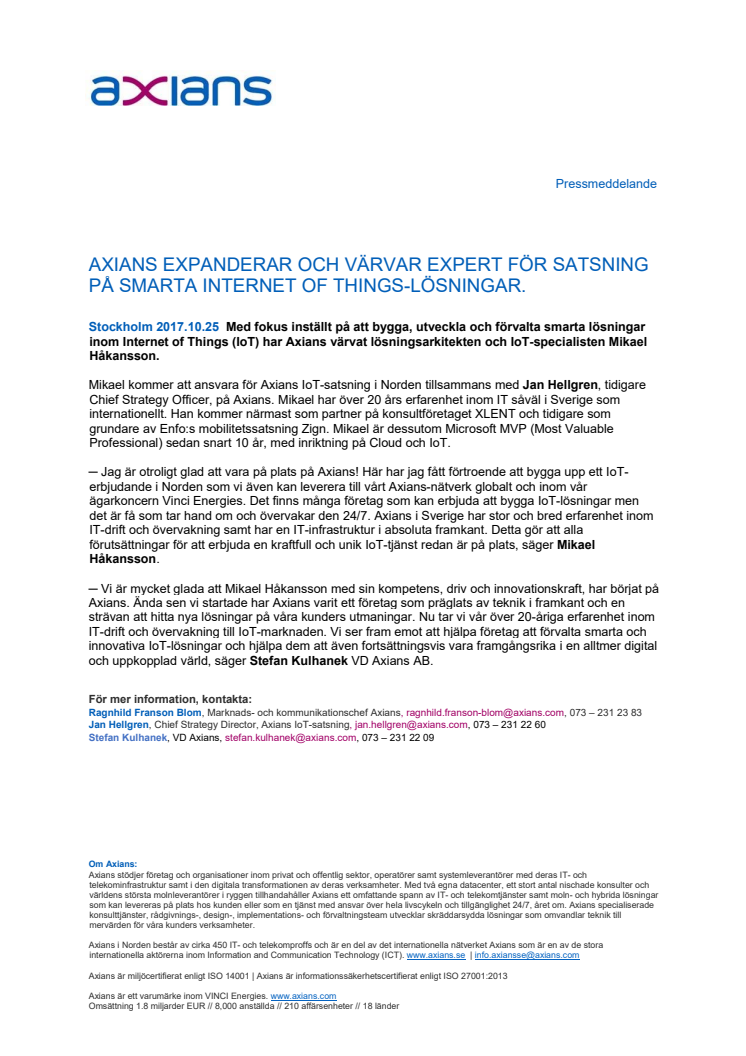 AXIANS EXPANDERAR OCH VÄRVAR EXPERT FÖR SATSNING PÅ SMARTA INTERNET OF THINGS-LÖSNINGAR