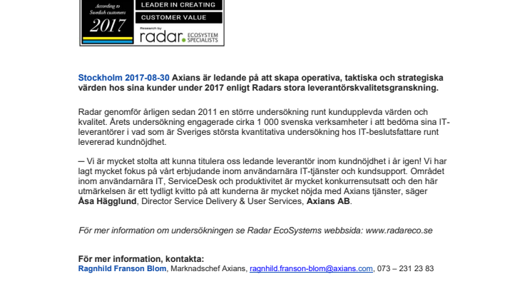 Axians är ledande på att skapa operativa, taktiska och strategiska värden hos sina kunder under 2017 enligt Radars stora leverantörskvalitetsgranskning.
