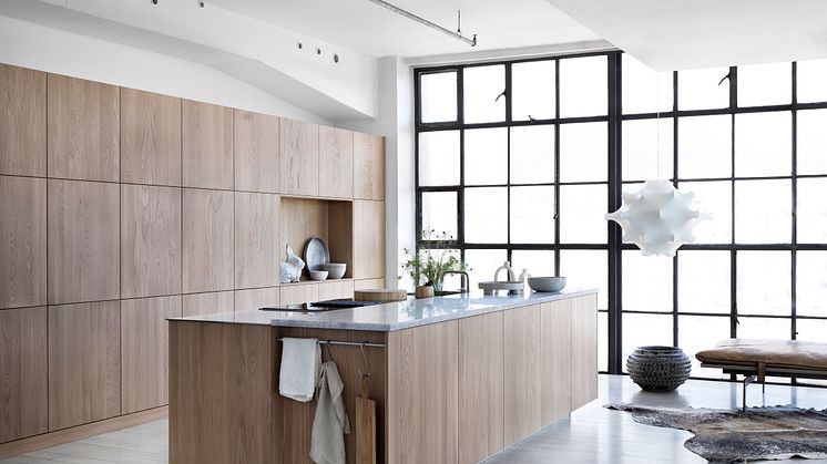 I Ballingslövs kökskollektion Selected Oak hittar vi Wood där den unika känslan av äkta trä lyfts fram på ett synnerligen spektakulärt vis. Notera de subtila vinklarna i det traditionella träslaget ek med en hundra år gammal yta, som resulterar i ett visuellt modernt kök. Ek är ett hårt träslag, tåligt och genuint. I Wood ser vi den lekfulla levande ytan i balans med en klassisk exklusivitet på den stramt designade köksluckan. En slät lucka, matt vitpigmenterad till en sam-metsmjuk yta och som med enkelhet kombineras med andra högaktuella material. Wood är en 18 mm massiv 3-skiktslimmad lucka och finns i alla de delar som krävs för att skapa sitt unika kök. Prisexempel, lucka 764x594 mm cirka 3500 kr ink moms. Köket lanseras 1/6 2018.