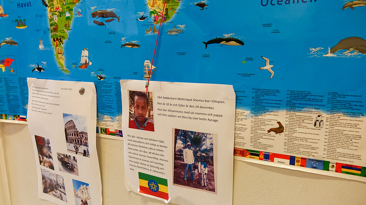 På väggen, i lagom barnhöjd, sitter ett fotografi på Muferiayat, en tioårig flicka från Etiopien, tillsammans med en världskarta och landets flagga. Sedan många år tillbaka har förskolan stöttat olika fadderbarn och deras familjer genom Barnfonden.