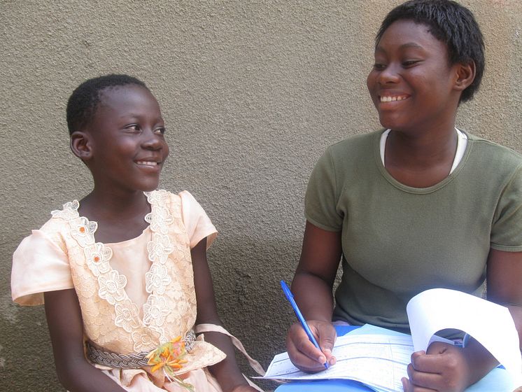 Amandine, 12 år från Burkina Faso intervjuas av personal från ChildFund Alliance