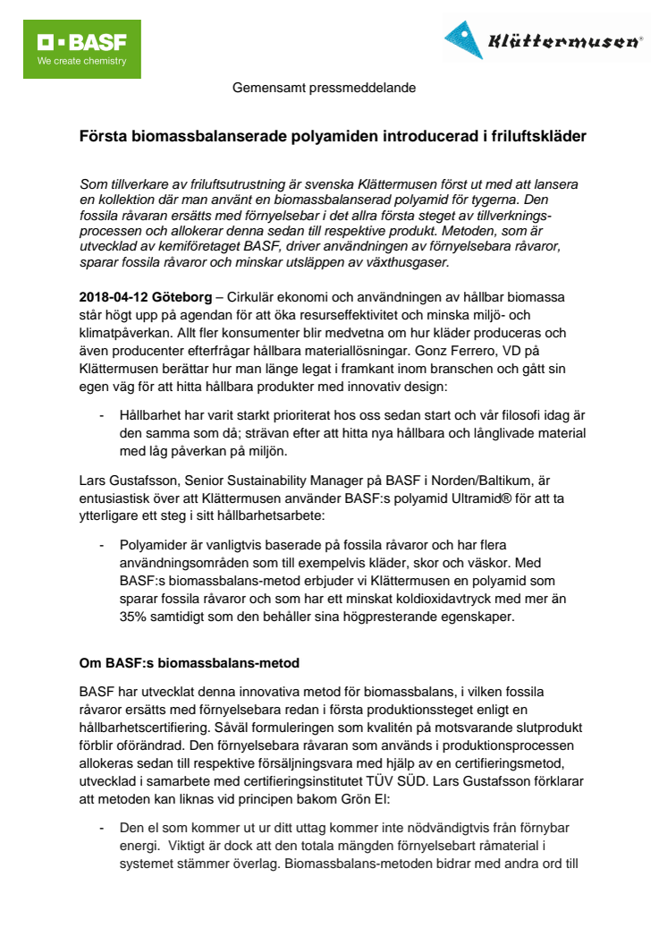 Som tillverkare av friluftsutrustning är svenska Klättermusen först ut med att lansera en kollektion där man använt en biomassbalanserad polyamid för tygerna. Metoden som använts för att ersätta fossil råvara med förnyelsebar i första produktionssteget, är utvecklad av BASF och driver användningen av förnyelsebara råvaror, sparar fossila råvaror och minskar utsläppen av växthusgaser.