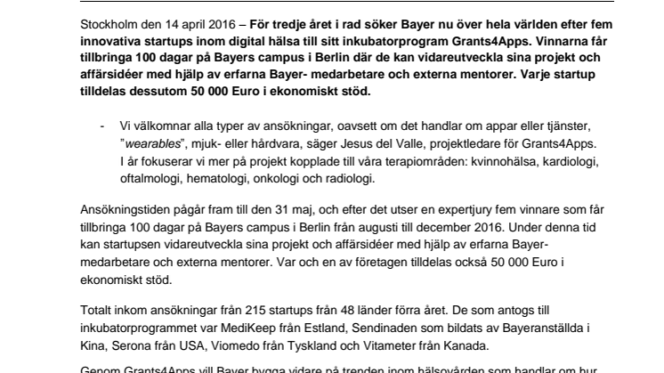 För tredje året i rad söker Bayer nu över hela världen efter fem innovativa startups inom digital hälsa till sitt inkubatorprogram Grants4Apps. Vinnarna får tillbringa 100 dagar på Bayers campus i Berlin där de kan vidareutveckla sina projekt och affärsidéer med hjälp av erfarna Bayer- medarbetare och externa mentorer. Varje startup tilldelas dessutom 50 000 Euro i ekonomiskt stöd.