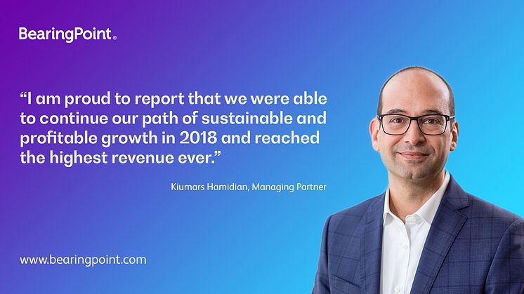 Stockholm, March 12, 2019 – Management and technology consultancy BearingPoint today announced record revenues of €739 million in 2018. The core Consulting business recorded 6% growth compared to 2017 with the software solutions business growing slightly slower than in previous years. BearingPoint remained strongly profitable even though the firm made significant investments.There was a smooth transition in leadership when longstanding executive Kiumars Hamidian took office as the new Managing Partner in September. Hamidian updated the strategy to navigate the firm through 2025 and put three areas into focus: markets, portfolio and people.