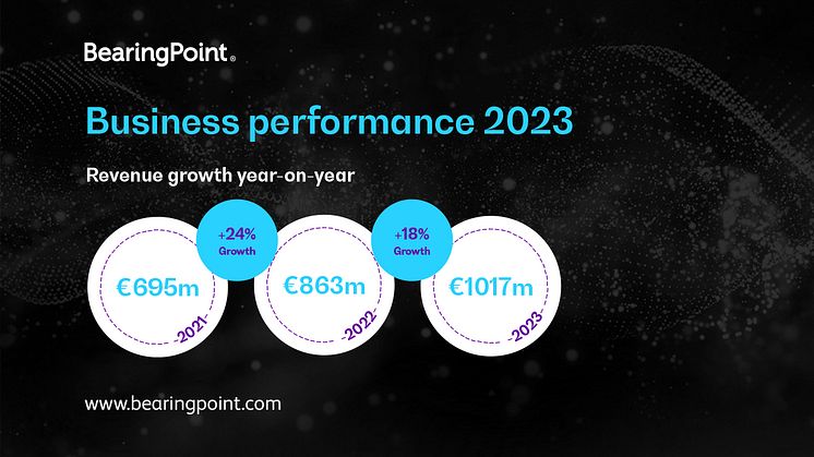 Amsterdam, 6 februari, 2024 – IT- och managementkonsultföretaget BearingPoint rapporterar intäkter på 1,017 miljarder euro för 2023, en ökning med 18% jämfört med föregående år. Företagets bokningar ökade med 21% och de levererade mer än 1 800 projekt i 32 länder. För att stödja tillväxten så ökade BearingPoint sin personalstyrka med 15% till mer än 6 000 anställda i slutet av året. För 2024 planerar BearingPoint att anställa mer än 1 600 personer för att fortsätta leverera på sin strategi och expandera globalt.