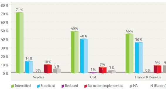 Almost half (46 percent) of respondents indicated that their companies had either increased or heavily increased the number of employees working on sustainability topics, reflecting the increase in efforts in social terms. The US in particular has raised its game, which is attributed to the fact that activity to date there has lagged European efforts by a visible margin.