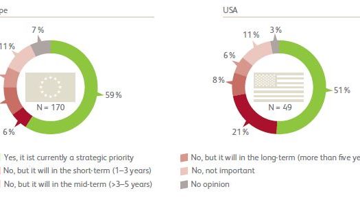 The study drilled down into environmental efforts by companies as well, with more than half the survey focused on the current state of green supply chains. Having a green supply chain is high on the agenda for 59 percent of European companies and for 51 percent of US companies. Considerably more US companies (21 percent compared with 6 percent of European companies) see it becoming an important priority in the short term (the next 1–3 years), as they strive to close the gap and bring their activities in line with Europe. The survey shows the current key drivers and willingness to invest, as well as the state of carbon accounting, eco-design and development, green production and procurement, logistics and recycling.