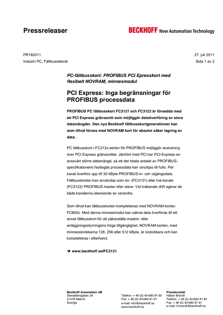 PROFIBUS PC fältbusskort FC3121 och FC3122 är försedda med ett PCI Express gränssnitt som möjliggör dataöverföring av stora datamängder. Den nya Beckhoff fältbusskortgenerationen kan som tillval förses med NOVRAM kort för absolut säker lagring av data.