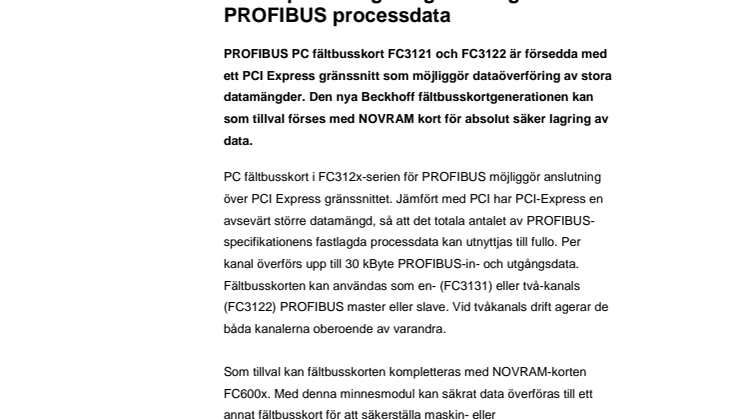 PROFIBUS PC fältbusskort FC3121 och FC3122 är försedda med ett PCI Express gränssnitt som möjliggör dataöverföring av stora datamängder. Den nya Beckhoff fältbusskortgenerationen kan som tillval förses med NOVRAM kort för absolut säker lagring av data.