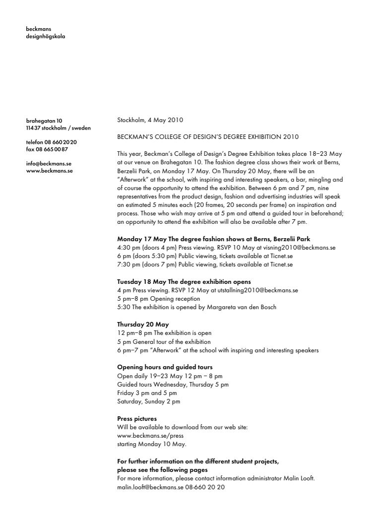 This year, Beckman’s College of Design’s Degree Exhibition takes place 18–23 May at our venue on Brahegatan 10 in Stockholm, Sweden. The fashion degree class shows their work at Berns, Berzelii Park, on Monday 17 May. On Thursday 20 May, there will be an ”Afterwork” at the school, with inspiring and interesting speakers, a bar, mingling and of course the opportunity to attend the exhibition.