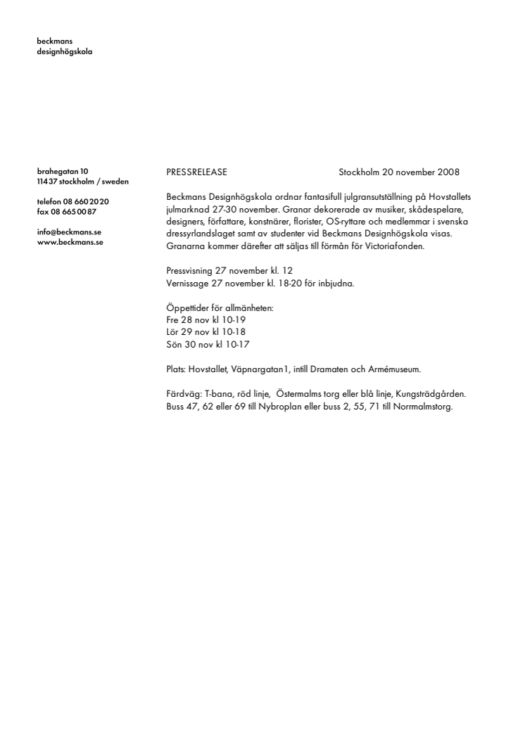 Beckmans Designhögskola ordnar fantasifull julgransutställning på Hovstallets julmarknad 27-30 november. Granar dekorerade av musiker, skådespelare, designers, författare, konstnärer, florister, OS-ryttare och medlemmar i svenska dressyrlandslaget samt av studenter vid Beckmans Designhögskola visas.