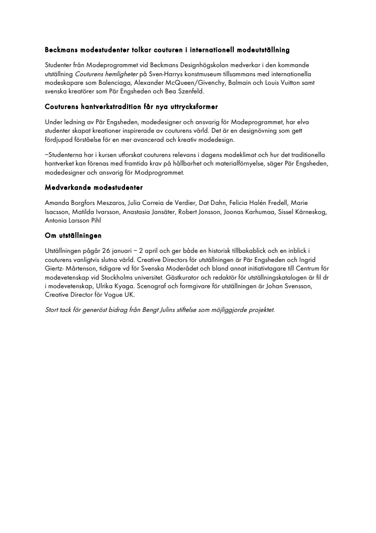 Studenter från Modeprogrammet vid Beckmans Designhögskolan medverkar i den kommande utställning Couturens hemligheter på Sven-Harrys konstmuseum tillsammans med internationella modeskapare som Balenciaga, Alexander McQueen/Givenchy, Balmain och Louis Vuitton samt svenska kreatörer som Pär Engsheden och Bea Szenfeld. Utställningen pågår 26 januari – 2 april 2018.
