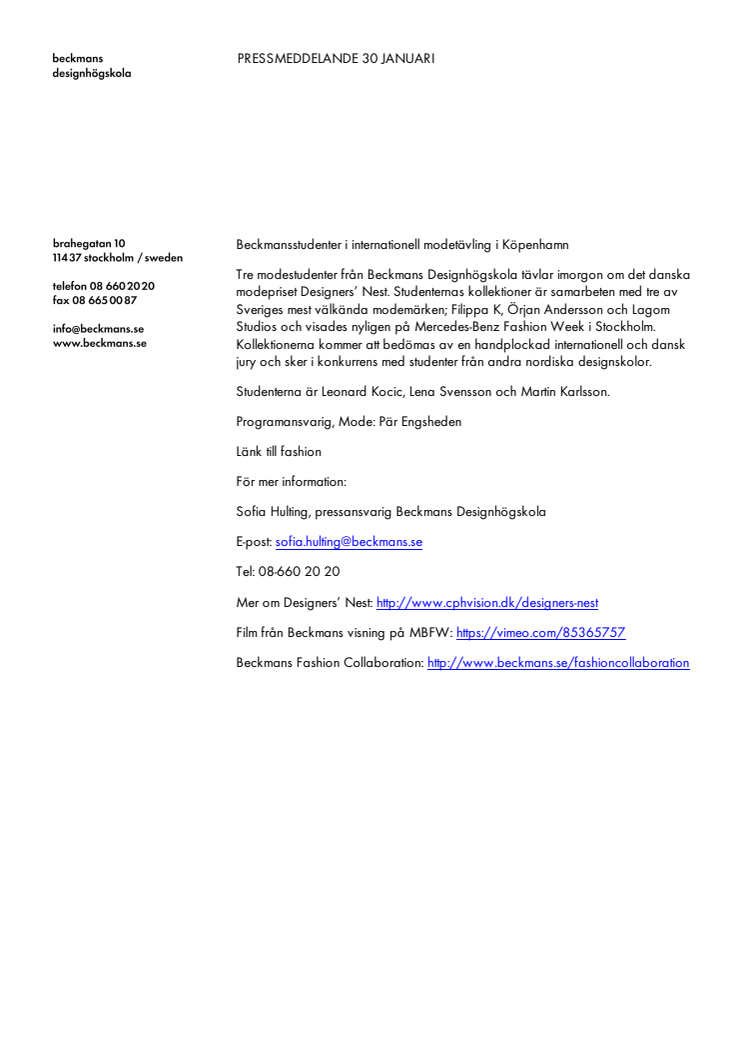 Tre modestudenter från Beckmans Designhögskola tävlar i helgen om det danska modepriset Designers’ Nest. Studenternas kollektioner är samarbeten med tre av Sveriges mest välkända modemärken; Filippa K, Örjan Andersson och Lagom Studios och visades nyligen på Mercedes-Benz Fashion Week i Stockholm.