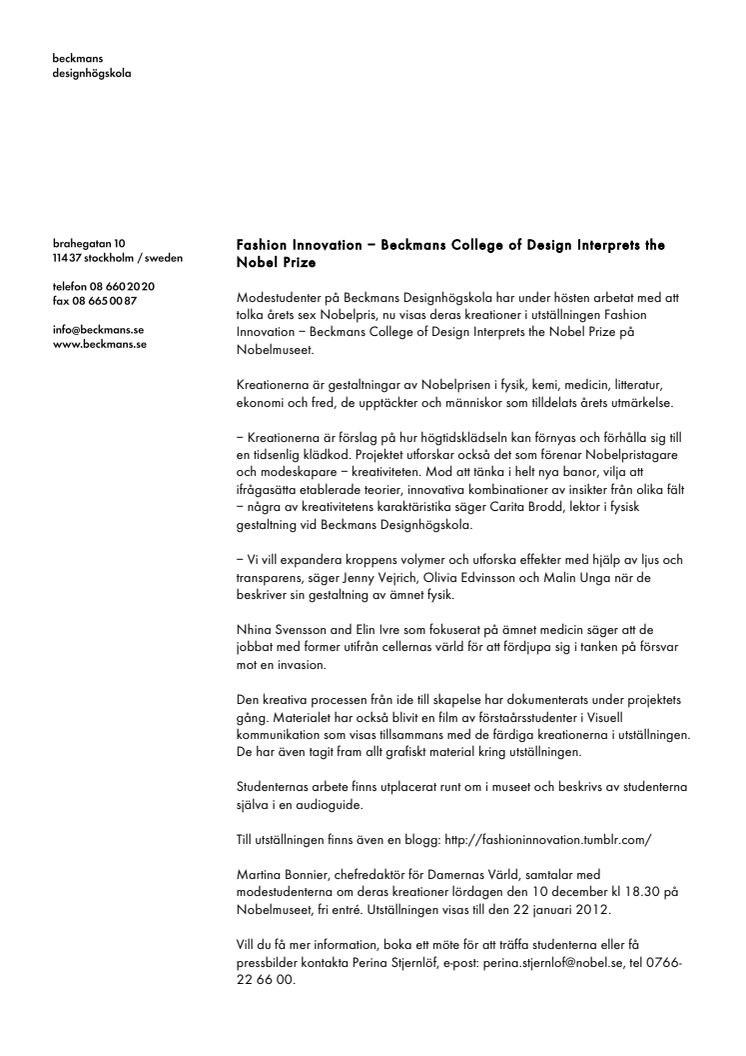 Modestudenter på Beckmans Designhögskola har under hösten arbetat med att tolka årets sex Nobelpris. Nu visas deras kreationer i utställningen Fashion Innovation – Beckmans College of Design interprets the Nobel prize på Nobelmuseet.