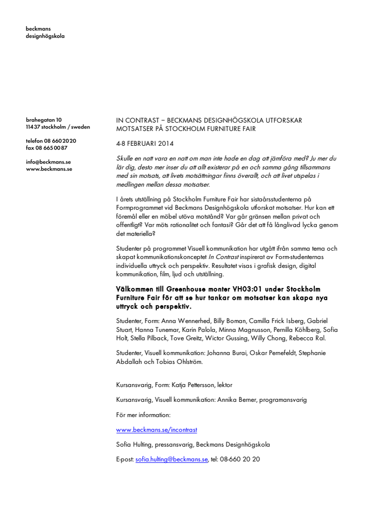 I årets utställning på Stockholm Furniture Fair har sistaårsstudenterna på Formprogrammet vid Beckmans Designhögskola utforskat motsatser. Hur kan ett föremål eller en möbel utöva motstånd? Var går gränsen mellan privat och offentligt? Var möts rationalitet och fantasi?