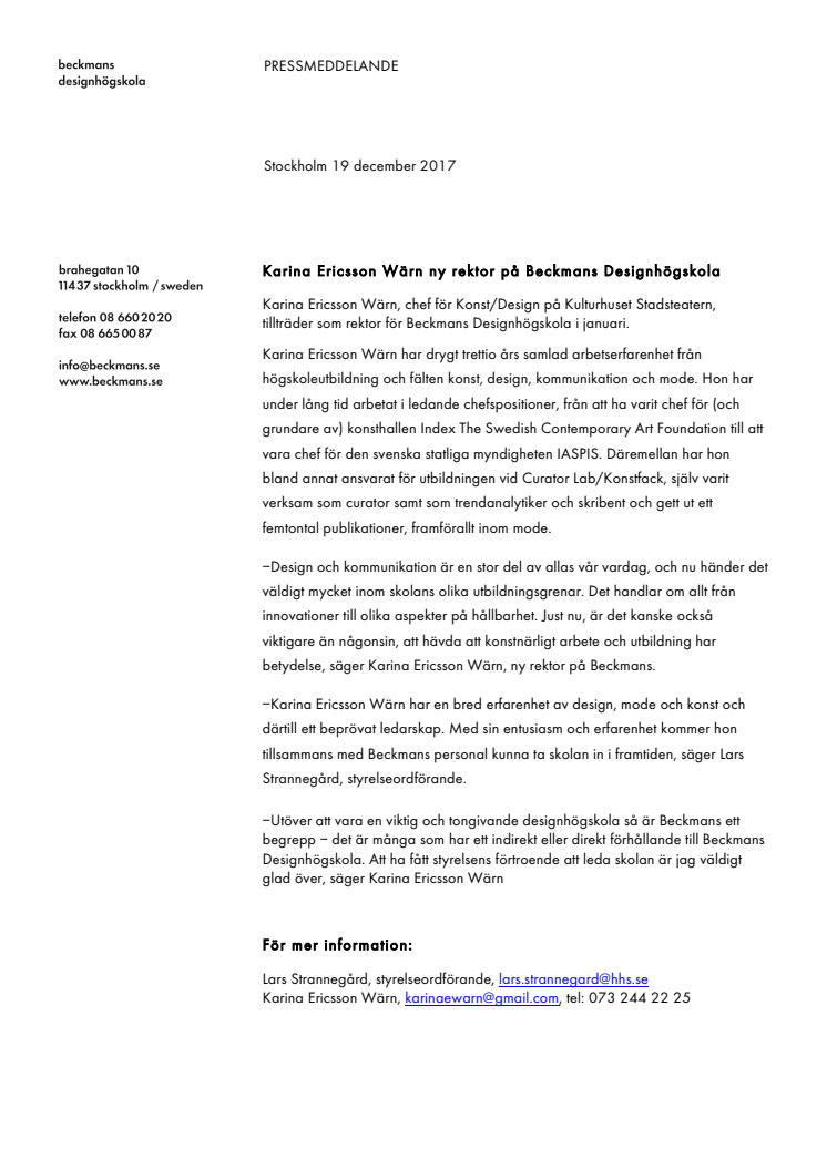 Karina Ericsson Wärn, chef för Konst/Design på Kulturhuset Stadsteatern, tillträder som rektor för Beckmans Designhögskola i januari.