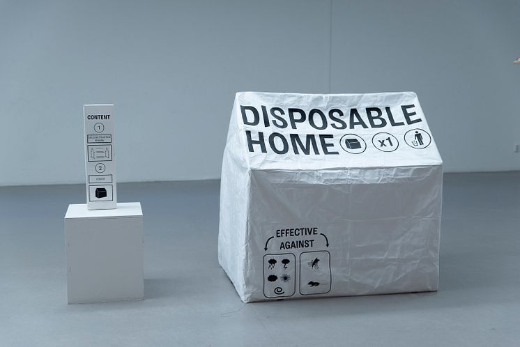 I verket DISPOSABLE HOME är hemmet en engångsartikel som får symbolisera de ohållbara och ojämlika premisser våra samhällen vilar på. DISPOSABLE HOME erbjuder det mest basala skydd ett hem behöver ha, men det är inte byggt för att hålla. När extrema miljöhändelser drar fram är det dessa hem som drabbas hårdast. När engångsartikeln är använd blir den ännu ett bidrag till ekosystemets förfall och en familj står utan hem, med ännu mindre möjligheter att hitta ett nytt.