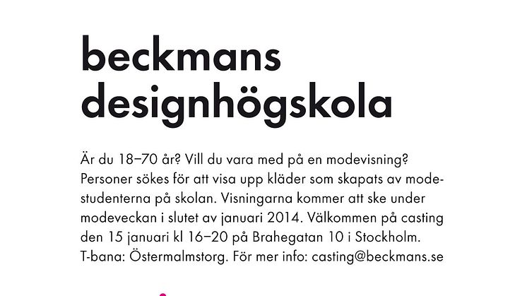 Välkommen på casting den 15 januari kl 16.00-20.00 på Beckmans Designhögskola, Brahegatan 10 i Stockholm, t-bana Östermalmstorg.