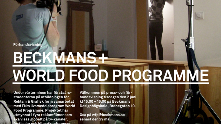 Under vårterminen har förstaårsstudenterna på utbildningen för Reklam & Grafisk form samarbetat med FN:s livsmedelsprogram World Food Programme. Projektet har utmynnat i fyra reklamfilmer som ska visas globalt på tv-kanaler, festivaler och klimatkonferenser. Välkommen på press- och förhandsvisning tisdagen den 2 juni kl 15.00 - 16.00 på Beckmans Designhögskola, Brahegatan 10.