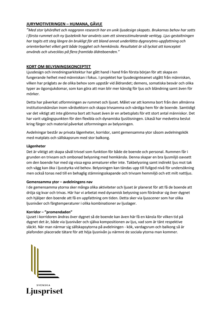 Jurymotiveringen och fakta om belysningskonceptet - Humana Gävle