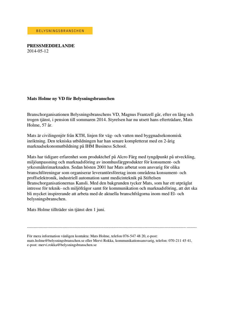 Belysningsbranschen VD, Magnus Frantzell går, efter en lång och trogen tjänst, i pension till sommaren 2014. Styrelsen har nu utsett hans efterträdare, Mats Holme, 57 år.