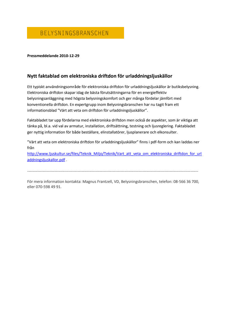 Nytt faktablad om elektroniska driftdon för urladdningsljuskällor