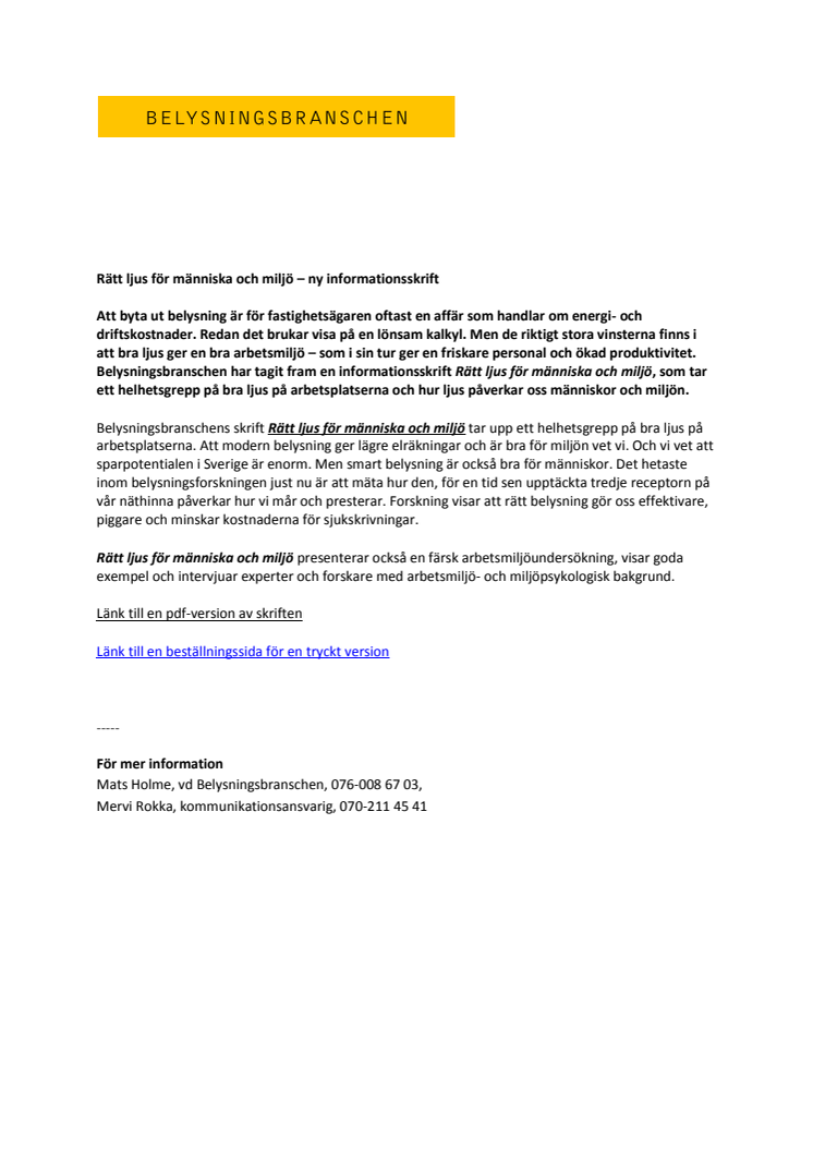 Rätt ljus för människa och miljö - ny informationsskrift från Belysningsbranschen